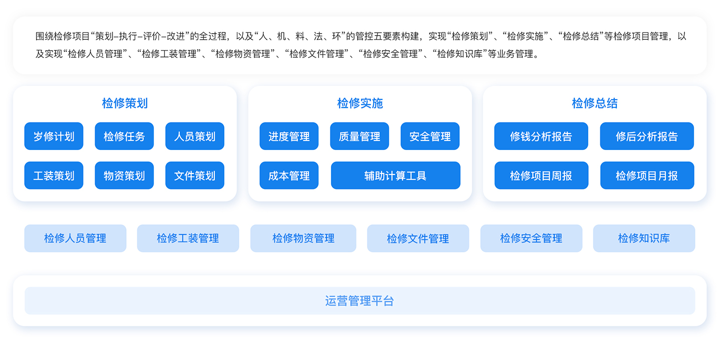 以水电检修项目为核心,以“云大物智移链”等技术为支撑,以服务水电检修人员为宗旨,实现检修项目的“启动、策划、执行、监控、收尾”全过程管理,实现检修项目的“人、机、料、法、环”全要素管控,实现管控能力的“项目智慧策划、现场立体感知、过程可视展示、结果智能分析”多方位提升